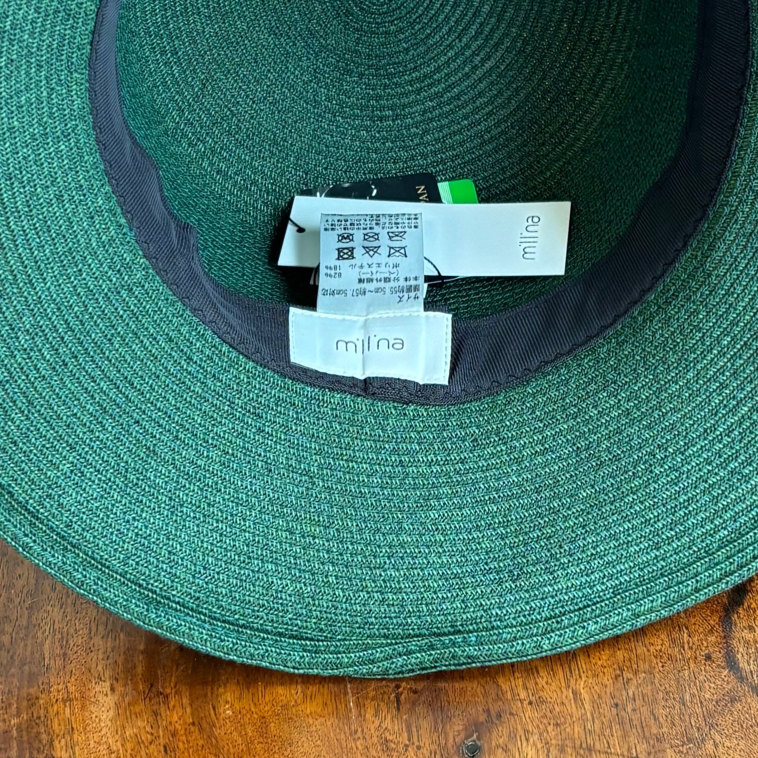 鮮やかなグリーンが夏の装いを引き立てる帽子です。シンプルなデザインなのでお洋服を選ばず日常使いに活躍してくれます。 サイズ:M(54.5〜56.5cm) つばの長さ:8cm 素材:ペーパー82%ポリエステル18% サイズ調整:可能 製造国:日本